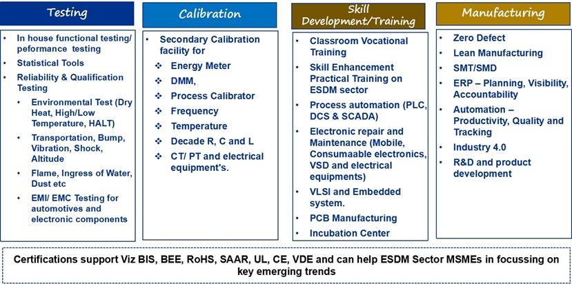 An ESDM focused MSME Technology Center, Greater Noida is being set up by the Ministry of MSME under the World Bank funded Technology Center System Programme (TCSP) in Greater Noida, Uttar Pradesh, to cater the technological and training needs of the ESDM clusters.